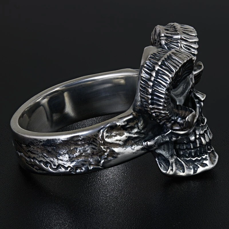 Серебряное мужское кольцо с черепом с большими рогами. Поверхность зачерненная и отполированная. Размер лицевой части: 18 мм. Средний вес изделия 12.67 гр. Все изделия собственного производства, гарантия 12 месяцев. Арт. 8106 Знак черепа широко распространен во многих культурах, чаще всего он является символом бессмертия и пути спасения. У кельтов это был знаком защищающим от злых сил, дарующий здоровье и успех. Символом защиты от смерти является для тех чей образ жизни связан с риском. В Русской Императорской армии символика черепа впервые использовалась в Отечественной войне 1812 года. Конный полк Петербургского ополчения назывался «Смертоносным» или «Бессмертным» полком. У чинов этой части головные уборы были украшены серебряными черепами.