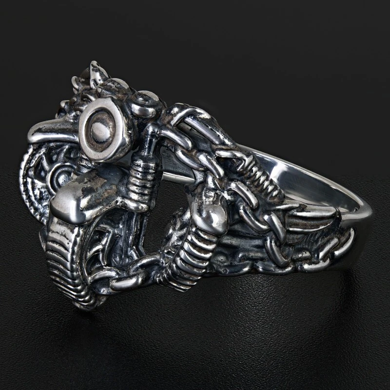 Серебряное мужское кольцо с мотоциклом. Поверхность зачерненная и отполированная. Размер лицевой части: 15 мм. Средний вес изделия 6.57 гр. Все изделия собственного производства, гарантия 12 месяцев. Арт. 8116