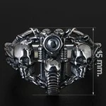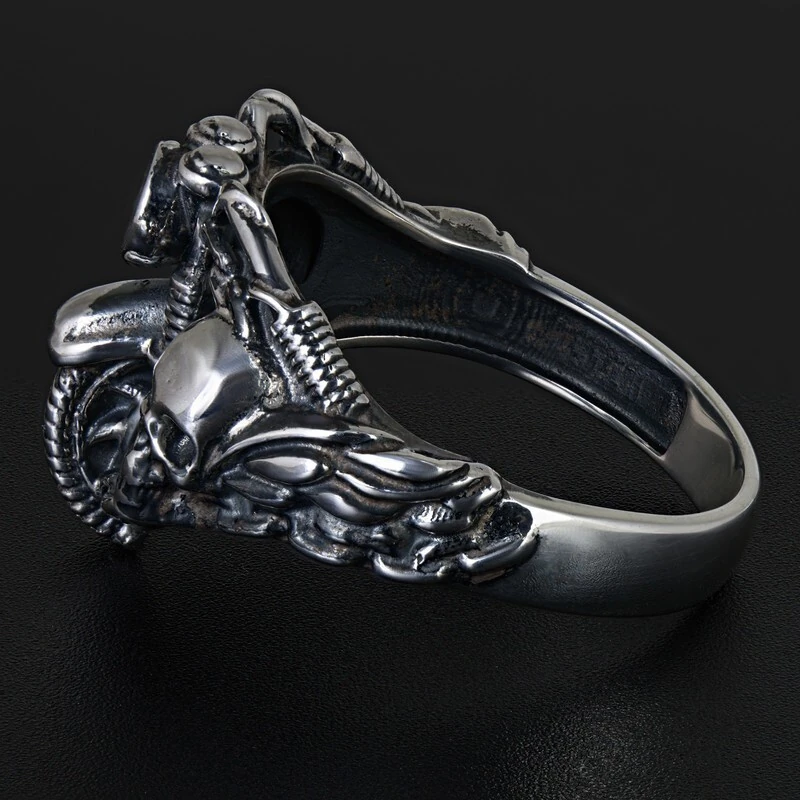Серебряное мужское кольцо - Мотоцикл с черепами. Поверхность зачерненная и отполированная. Размер лицевой части: мм. Средний вес изделия 6.17 гр. Все изделия собственного производства, гарантия 12 месяцев. Арт. 8117 Знак черепа широко распространен во многих культурах, чаще всего он является символом бессмертия и пути спасения. У кельтов это был знаком защищающим от злых сил, дарующий здоровье и успех. Символом защиты от смерти является для тех чей образ жизни связан с риском. В Русской Императорской армии символика черепа впервые использовалась в Отечественной войне 1812 года. Конный полк Петербургского ополчения назывался «Смертоносным» или «Бессмертным» полком. У чинов этой части головные уборы были украшены серебряными черепами.
