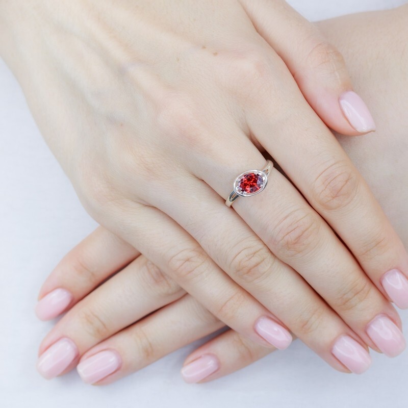 Серебряное кольцо с нанокристаллом, цвет красный - коллекция Фрейя. Средний вес изделия с камнями 2.13 гр. Размер главного камня: овал 6*8 мм. Нанокристалл - синтезированный ювелирный нанокристалл, превосходящий по блеску, преломлению света, твердости, плотности простой фианит. Все изделия собственного производства, гарантия 12 месяцев. Арт. 8285.