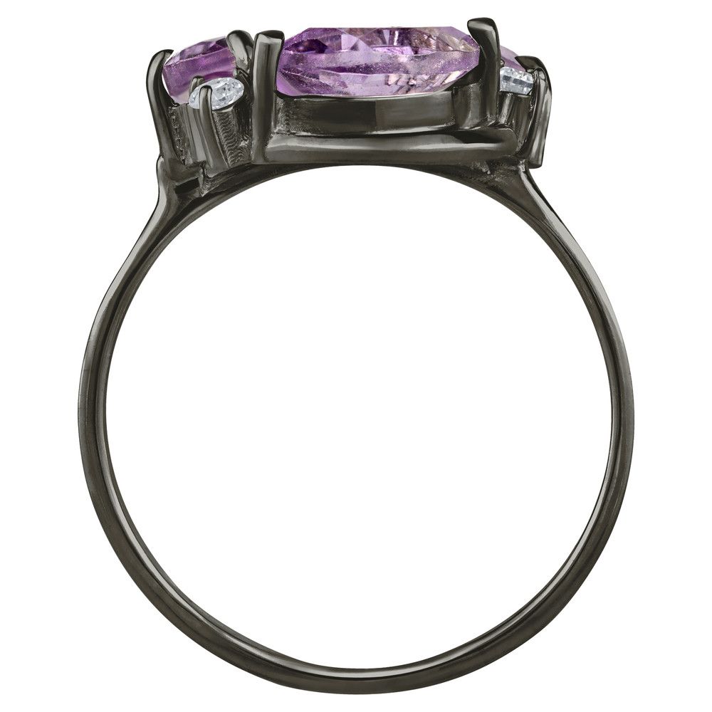 Серебряное кольцо "Фортуна" с натуральным аметистом, покрытие Черный Родий. Средний вес украшения с камнями 3,16 гр. Месторождение(я) камней: Аметист (Приполярный Урал, Россия). Аметист (Натуральный) маркиз: 4*8 мм., средний вес 0,50 карат. Аметист (Натуральный) овал: 5*7 мм., средний вес 0,80 карат. Аметист (Натуральный) груша: 5*7 мм., средний вес 0,70 карат. Циркон белый (Натуральный) круг: 2 мм., средний вес 0,05 карат. Размер лицевой части: 13*15 мм. Все изделия собственного производства и имеют гарантию 12 месяцев. Арт. 6613BR. Аметист — прозрачный или полупрозрачный камень фиолетовых оттенков, подвид кварца. Он гармонизирует разум, снимает стресс, улучшает кровообращение, способствует умственному развитию и личностному росту. Считается, что он также оберегает от головной боли и бессонницы, служит противоядием, помогает избавиться от алкоголизма и наделяет владельца проницательностью, раскрывая «третий глаз» (за который отвечает чакра аджна). В медитации помогает расслабиться и успокоиться. Положенный под подушку, аметист приносит хорошие сны.