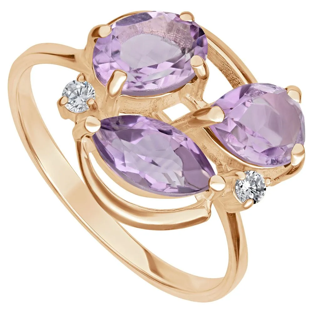Серебряное кольцо "Фортуна" с натуральным аметистом, покрытие Розовое Золото. Средний вес украшения с камнями 3,16 гр. Месторождение(я) камней: Аметист (Приполярный Урал, Россия). Аметист (Натуральный) маркиз: 4*8 мм., средний вес 0,50 карат. Аметист (Натуральный) овал: 5*7 мм., средний вес 0,80 карат. Аметист (Натуральный) груша: 5*7 мм., средний вес 0,70 карат. Циркон белый (Натуральный) круг: 2 мм., средний вес 0,05 карат. Размер лицевой части: 13*15 мм. Все изделия собственного производства и имеют гарантию 12 месяцев. Арт. 6613PG. Аметист — прозрачный или полупрозрачный камень фиолетовых оттенков, подвид кварца. Он гармонизирует разум, снимает стресс, улучшает кровообращение, способствует умственному развитию и личностному росту. Считается, что он также оберегает от головной боли и бессонницы, служит противоядием, помогает избавиться от алкоголизма и наделяет владельца проницательностью, раскрывая «третий глаз» (за который отвечает чакра аджна). В медитации помогает расслабиться и успокоиться. Положенный под подушку, аметист приносит хорошие сны.
