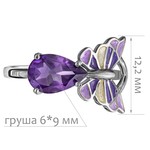 Серебряное кольцо с натуральным аметистом и эмалью - коллекция Бабочка, покрытие Палладий. Средний вес украшения с камнями 2.41 гр. Месторождение: Аметист (Приполярный Урал, Россия). Аметист (Натуральный) груша 6*9 мм., средний вес: 1.24 карат. Все изделия собственного производства и имеют гарантию 12 месяцев, к каждому изделию прилагается паспорт. Арт. 8448PD. Аметист — прозрачный или полупрозрачный камень фиолетовых оттенков, подвид кварца. Он гармонизирует разум, снимает стресс, улучшает кровообращение, способствует умственному развитию и личностному росту. Считается, что он также оберегает от головной боли и бессонницы, служит противоядием, помогает избавиться от алкоголизма и наделяет владельца проницательностью, раскрывая «третий глаз» (за который отвечает чакра аджна). В медитации помогает расслабиться и успокоиться. Положенный под подушку, аметист приносит хорошие сны.