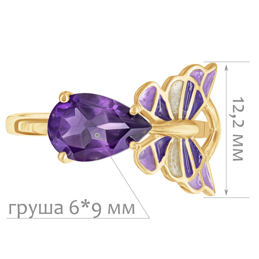 Серебряное кольцо с натуральным аметистом и эмалью - коллекция Бабочка, покрытие Желтое Золото. Средний вес украшения с камнями 2.41 гр. Месторождение: Аметист (Приполярный Урал, Россия). Аметист (Натуральный) груша 6*9 мм., средний вес: 1.24 карат. Все изделия собственного производства и имеют гарантию 12 месяцев, к каждому изделию прилагается паспорт. Арт. 8448YG. Аметист — прозрачный или полупрозрачный камень фиолетовых оттенков, подвид кварца. Он гармонизирует разум, снимает стресс, улучшает кровообращение, способствует умственному развитию и личностному росту. Считается, что он также оберегает от головной боли и бессонницы, служит противоядием, помогает избавиться от алкоголизма и наделяет владельца проницательностью, раскрывая «третий глаз» (за который отвечает чакра аджна). В медитации помогает расслабиться и успокоиться. Положенный под подушку, аметист приносит хорошие сны.