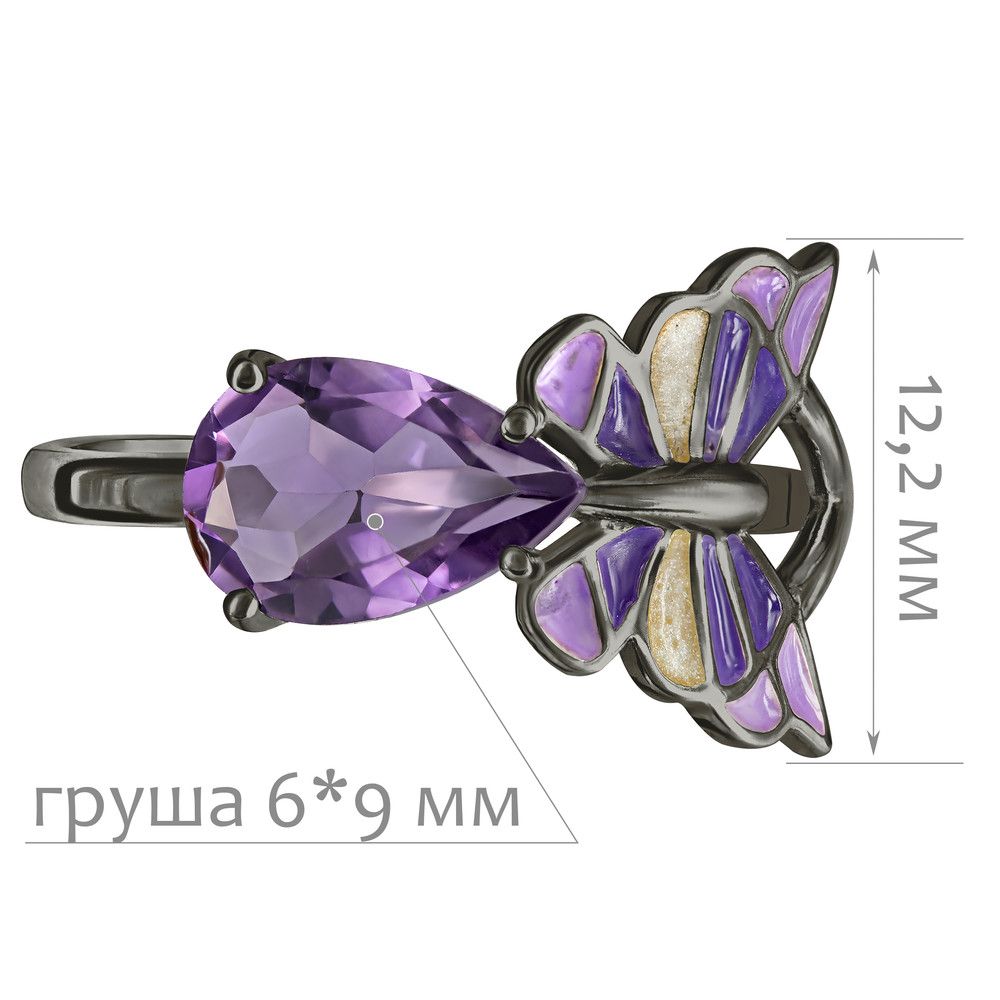 Серебряное кольцо с натуральным аметистом и эмалью - коллекция Бабочка, покрытие Черный Родий. Средний вес украшения с камнями 2.5 гр. Месторождение: Аметист (Приполярный Урал, Россия). Аметист (Натуральный) груша 6*9 мм., средний вес: 1.24 карат. Все изделия собственного производства и имеют гарантию 12 месяцев, к каждому изделию прилагается паспорт. Арт. 8449BR. Аметист — прозрачный или полупрозрачный камень фиолетовых оттенков, подвид кварца. Он гармонизирует разум, снимает стресс, улучшает кровообращение, способствует умственному развитию и личностному росту. Считается, что он также оберегает от головной боли и бессонницы, служит противоядием, помогает избавиться от алкоголизма и наделяет владельца проницательностью, раскрывая «третий глаз» (за который отвечает чакра аджна). В медитации помогает расслабиться и успокоиться. Положенный под подушку, аметист приносит хорошие сны.
