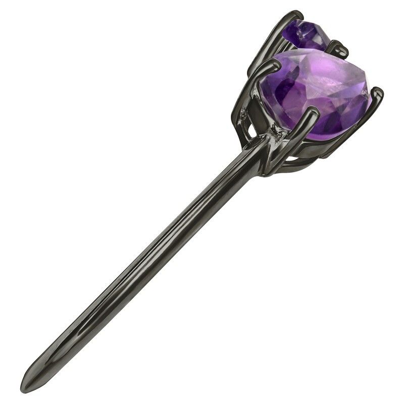 Серебряное кольцо с натуральным аметистом (темный) - коллекция Дуэт / покрытие Черный Родий.Средний вес украшения с камнями 1.52 гр.Месторождение(я): Аметист (Приполярный Урал, Россия).Ювелирные вставки:Аметист (Натуральный) груша 5*7 мм., средний вес: 0.65 карат.Все изделия собственного производства и имеют гарантию 12 месяцев. Арт. 8621BR. Аметист — прозрачный или полупрозрачный камень фиолетовых оттенков, подвид кварца. Он гармонизирует разум, снимает стресс, улучшает кровообращение, способствует умственному развитию и личностному росту. Считается, что он также оберегает от головной боли и бессонницы, служит противоядием, помогает избавиться от алкоголизма и наделяет владельца проницательностью, раскрывая «третий глаз» (за который отвечает чакра аджна). В медитации помогает расслабиться и успокоиться. Положенный под подушку, аметист приносит хорошие сны.