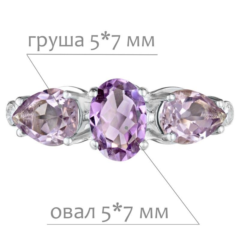 Серебряное кольцо с натуральным аметистом (светлый) - коллекция Сансара / Без покрытия.Средний вес украшения с камнями 2.23 гр.Месторождение(я): Аметист (Приполярный Урал, Россия).Ювелирные вставки:Аметист (Натуральный) овал 5*7 мм., средний вес: 0.72 карат.Аметист (Натуральный) груша 5*7 мм., средний вес: 0.65 карат.Белый Нанокристалл круг 2 мм., средний вес: 0.06 карат.Все изделия собственного производства и имеют гарантию 12 месяцев. Арт. 8639NP. Аметист — прозрачный или полупрозрачный камень фиолетовых оттенков, подвид кварца. Он гармонизирует разум, снимает стресс, улучшает кровообращение, способствует умственному развитию и личностному росту. Считается, что он также оберегает от головной боли и бессонницы, служит противоядием, помогает избавиться от алкоголизма и наделяет владельца проницательностью, раскрывая «третий глаз» (за который отвечает чакра аджна). В медитации помогает расслабиться и успокоиться. Положенный под подушку, аметист приносит хорошие сны.