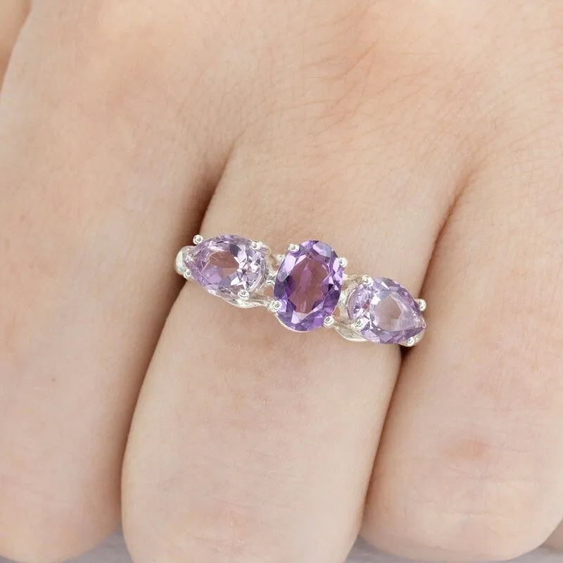Серебряное кольцо с натуральным аметистом (светлый) - коллекция Сансара / покрытие Белый Родий.Средний вес украшения с камнями 2.24 гр.Месторождение(я): Аметист (Приполярный Урал, Россия).Ювелирные вставки:Аметист (Натуральный) овал 5*7 мм., средний вес: 0.72 карат.Аметист (Натуральный) груша 5*7 мм., средний вес: 0.65 карат.Белый Нанокристалл круг 2 мм., средний вес: 0.06 карат.Все изделия собственного производства и имеют гарантию 12 месяцев. Арт. 8639WR. Аметист — прозрачный или полупрозрачный камень фиолетовых оттенков, подвид кварца. Он гармонизирует разум, снимает стресс, улучшает кровообращение, способствует умственному развитию и личностному росту. Считается, что он также оберегает от головной боли и бессонницы, служит противоядием, помогает избавиться от алкоголизма и наделяет владельца проницательностью, раскрывая «третий глаз» (за который отвечает чакра аджна). В медитации помогает расслабиться и успокоиться. Положенный под подушку, аметист приносит хорошие сны.