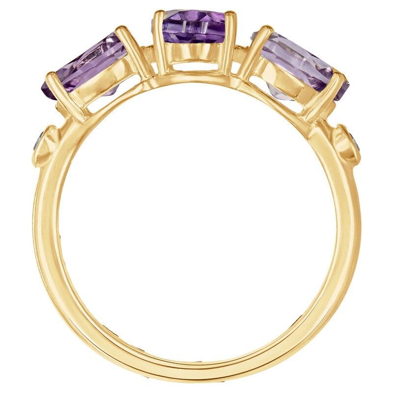 Серебряное кольцо с натуральным аметистом (светлый) - коллекция Сансара / покрытие Желтое Золото.Средний вес украшения с камнями 2.31 гр.Месторождение(я): Аметист (Приполярный Урал, Россия).Ювелирные вставки:Аметист (Натуральный) овал 5*7 мм., средний вес: 0.72 карат.Аметист (Натуральный) груша 5*7 мм., средний вес: 0.65 карат.Белый Нанокристалл круг 2 мм., средний вес: 0.06 карат.Все изделия собственного производства и имеют гарантию 12 месяцев. Арт. 8639YG. Аметист — прозрачный или полупрозрачный камень фиолетовых оттенков, подвид кварца. Он гармонизирует разум, снимает стресс, улучшает кровообращение, способствует умственному развитию и личностному росту. Считается, что он также оберегает от головной боли и бессонницы, служит противоядием, помогает избавиться от алкоголизма и наделяет владельца проницательностью, раскрывая «третий глаз» (за который отвечает чакра аджна). В медитации помогает расслабиться и успокоиться. Положенный под подушку, аметист приносит хорошие сны.