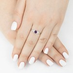 Серебряное кольцо с натуральным аметистом (темный) - коллекция Нова / покрытие Красное Золото.Средний вес украшения с камнями 1.24 гр.Месторождение(я): Аметист (Приполярный Урал, Россия).Ювелирные вставки:Аметист (Натуральный) круг 5 мм., средний вес: 0.48 карат.Белый Нанокристалл круг 2 мм., средний вес: 0.06 карат.Все изделия собственного производства и имеют гарантию 12 месяцев. Арт. 8653RG. Аметист — прозрачный или полупрозрачный камень фиолетовых оттенков, подвид кварца. Он гармонизирует разум, снимает стресс, улучшает кровообращение, способствует умственному развитию и личностному росту. Считается, что он также оберегает от головной боли и бессонницы, служит противоядием, помогает избавиться от алкоголизма и наделяет владельца проницательностью, раскрывая «третий глаз» (за который отвечает чакра аджна). В медитации помогает расслабиться и успокоиться. Положенный под подушку, аметист приносит хорошие сны.