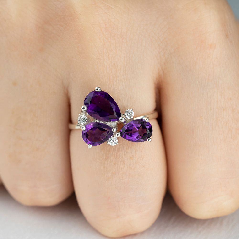 Серебряное кольцо с натуральным аметистом (темным) - коллекция Капель / покрытие Черный Родий. Средний вес украшения с камнями 3.11 гр. Месторождение: Аметист (Приполярный Урал, Россия) Ювелирные вставки: Аметист (Натуральный) груша 6*9 мм., средний вес: 1.24 карат. Аметист (Натуральный) груша 5*7 мм., средний вес: 0.65 карат. Все изделия собственного производства и имеют гарантию 12 месяцев. Арт. 8770BR. Аметист — прозрачный или полупрозрачный камень фиолетовых оттенков, подвид кварца. Он гармонизирует разум, снимает стресс, улучшает кровообращение, способствует умственному развитию и личностному росту. Считается, что он также оберегает от головной боли и бессонницы, служит противоядием, помогает избавиться от алкоголизма и наделяет владельца проницательностью, раскрывая «третий глаз» (за который отвечает чакра аджна). В медитации помогает расслабиться и успокоиться. Положенный под подушку, аметист приносит хорошие сны.