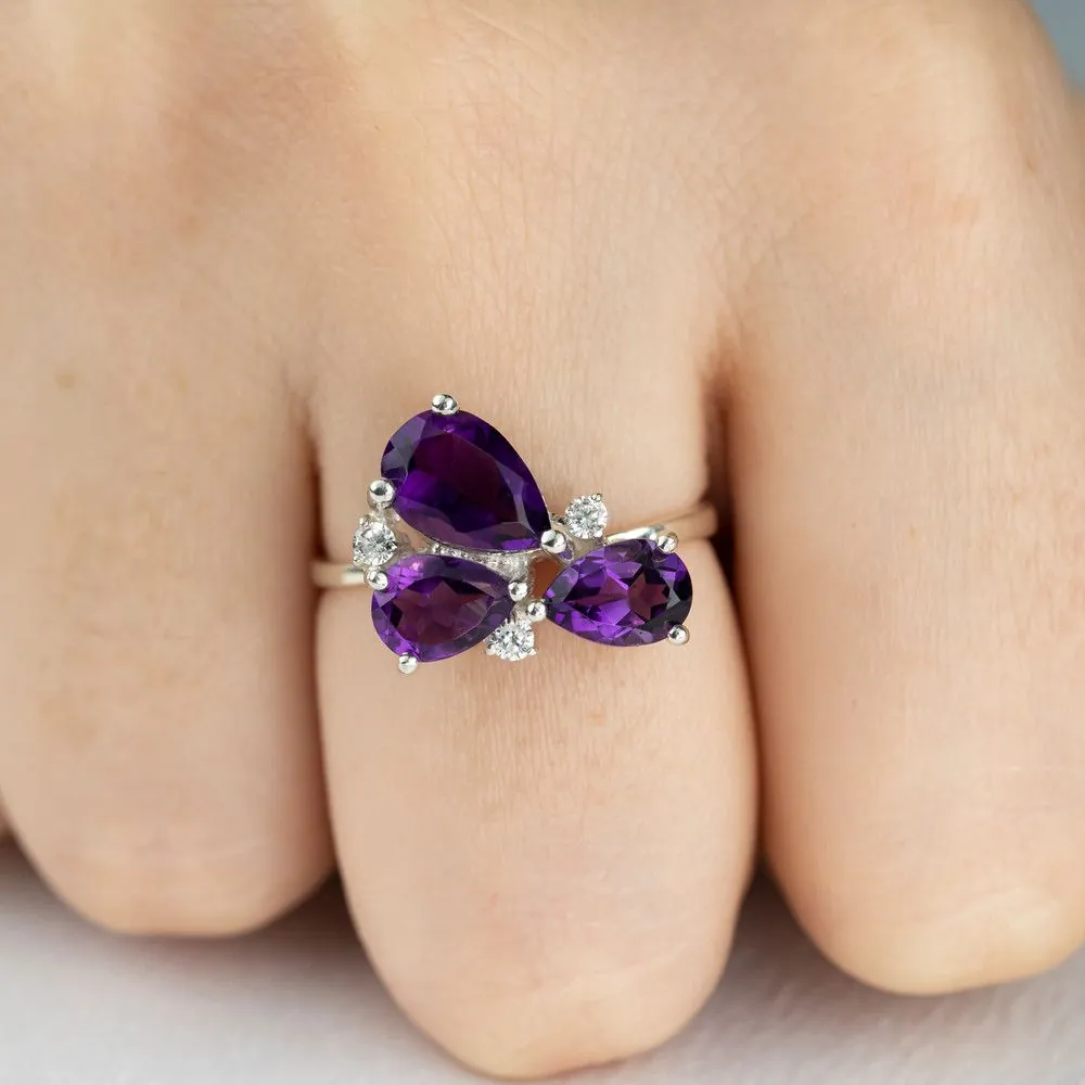 Серебряное кольцо с натуральным аметистом (темным) - коллекция Капель / покрытие Желтое Золото. Средний вес украшения с камнями 3.05 гр. Месторождение: Аметист (Приполярный Урал, Россия) Ювелирные вставки: Аметист (Натуральный) груша 6*9 мм., средний вес: 1.24 карат. Аметист (Натуральный) груша 5*7 мм., средний вес: 0.65 карат. Все изделия собственного производства и имеют гарантию 12 месяцев. Арт. 8770YG. Аметист — прозрачный или полупрозрачный камень фиолетовых оттенков, подвид кварца. Он гармонизирует разум, снимает стресс, улучшает кровообращение, способствует умственному развитию и личностному росту. Считается, что он также оберегает от головной боли и бессонницы, служит противоядием, помогает избавиться от алкоголизма и наделяет владельца проницательностью, раскрывая «третий глаз» (за который отвечает чакра аджна). В медитации помогает расслабиться и успокоиться. Положенный под подушку, аметист приносит хорошие сны.
