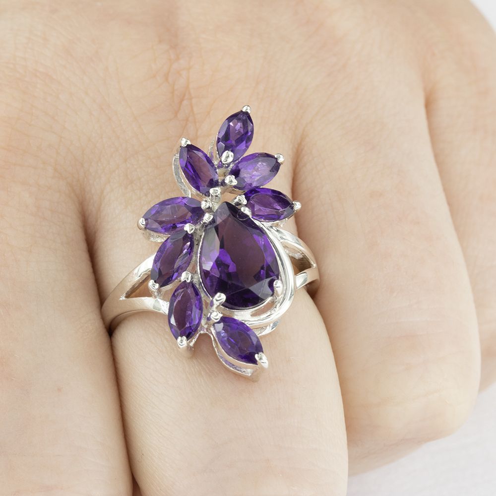 Серебряное кольцо с натуральным аметистом (темным) - коллекция Элегия / покрытие Черный Родий. Средний вес украшения с камнями 3.97 гр. Месторождение: Аметист (Приполярный Урал, Россия) Ювелирные вставки: Аметист (Натуральный) груша 7*10 мм., средний вес: 1.7 карат. Аметист (Натуральный) маркиз 3*6 мм., средний вес: 0.26 карат. Все изделия собственного производства и имеют гарантию 12 месяцев. Арт. 8779BR. Аметист — прозрачный или полупрозрачный камень фиолетовых оттенков, подвид кварца. Он гармонизирует разум, снимает стресс, улучшает кровообращение, способствует умственному развитию и личностному росту. Считается, что он также оберегает от головной боли и бессонницы, служит противоядием, помогает избавиться от алкоголизма и наделяет владельца проницательностью, раскрывая «третий глаз» (за который отвечает чакра аджна). В медитации помогает расслабиться и успокоиться. Положенный под подушку, аметист приносит хорошие сны.