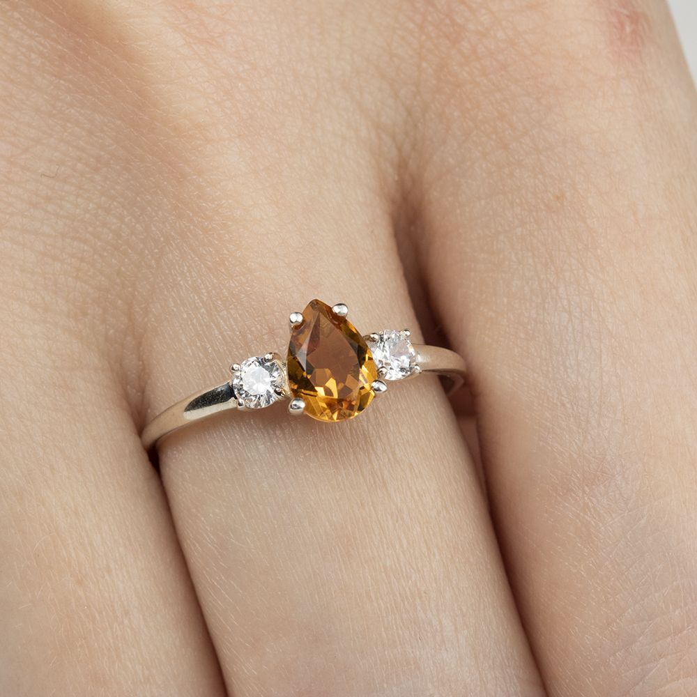 Серебряное кольцо с натуральным цитрином - коллекция Алсу (малая) / Розовое Золото. Средний вес украшения с камнями 1.35 гр. Месторождение: Цитрин (Замбия, Восточная Африка). Ювелирные вставки: Цитрин (Натуральный) груша 5*7 мм., средний вес: 0.6 карат. Белый Нанокристалл круг 3 мм. Все изделия собственного производства и имеют гарантию 12 месяцев, к каждому изделию прилагается паспорт. Арт. 8807PG