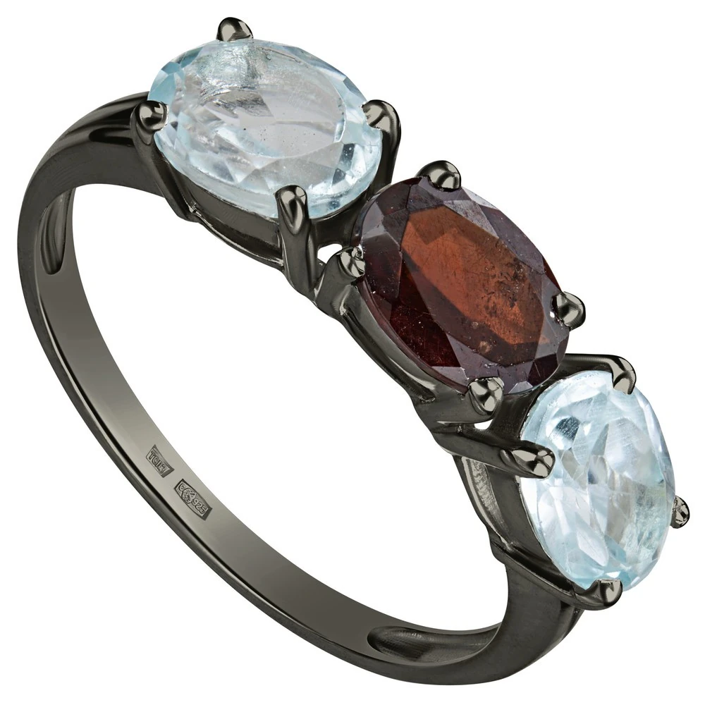 Серебряное кольцо с натуральными камнями гранат и топаз - коллекция Муза, покрытие Черный Родий.