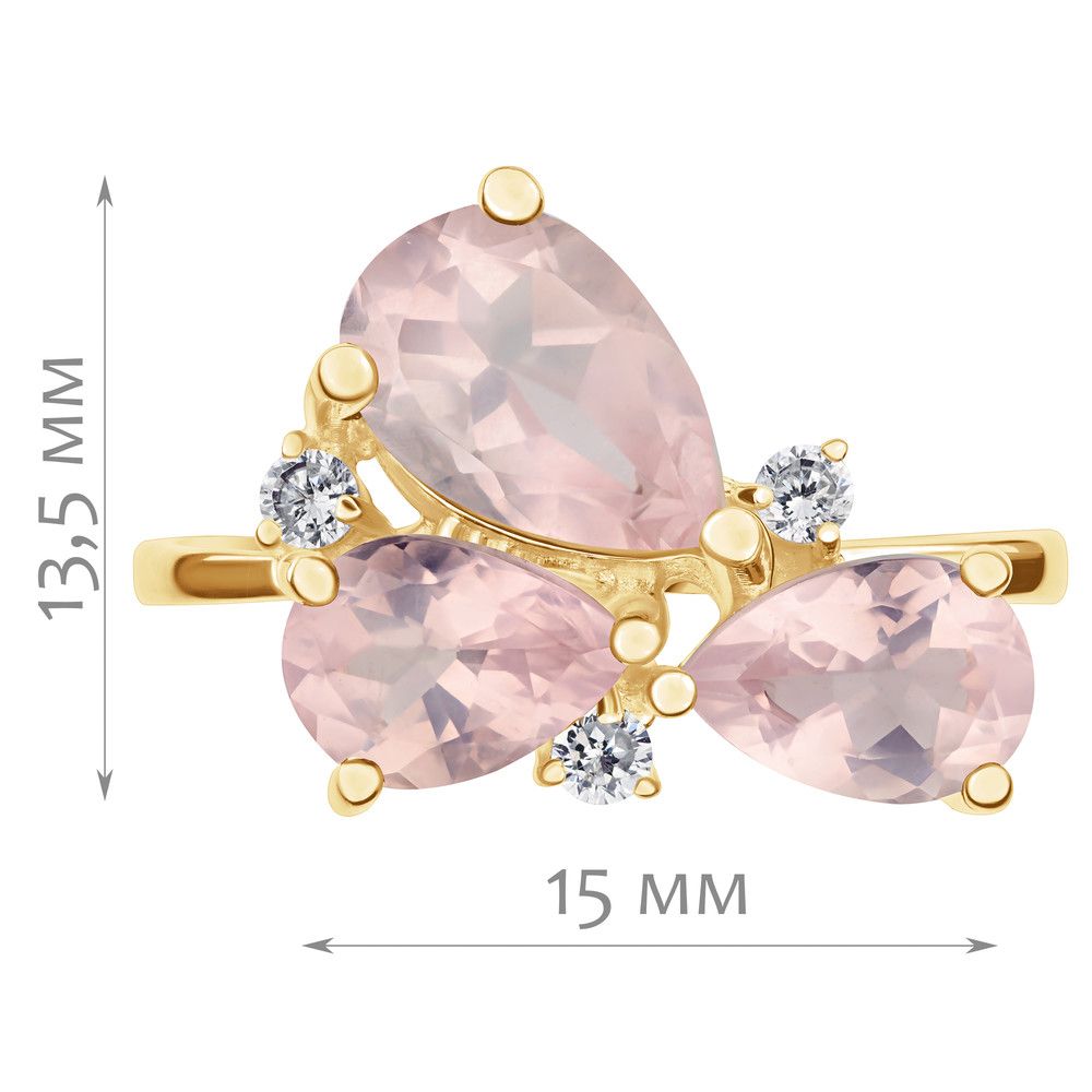 Серебряное кольцо с натуральным розовым кварцем - коллекция Капель / покрытие Желтое Золото. Средний вес украшения с камнями 3.11 гр. Месторождение: Розовый кварц (Приполярный Урал, Россия) Ювелирные вставки: Розовый кварц (Натуральный) груша 6*9 мм., средний вес: 1.16 карат. Розовый кварц (Натуральный) груша 5*7 мм., средний вес: 0.76 карат. Все изделия собственного производства и имеют гарантию 12 месяцев. Арт. 8769YG. Розовый кварц – камень сердца. Такое название он получил за способность приносить умиротворение и любовь. Он дарит сочувствие и глубокое понимание гармонии мира. Не обделён он и лечебными свойствами. Это талисман для привлечения в жизнь глубоких чувств и обретения семейного счастья.