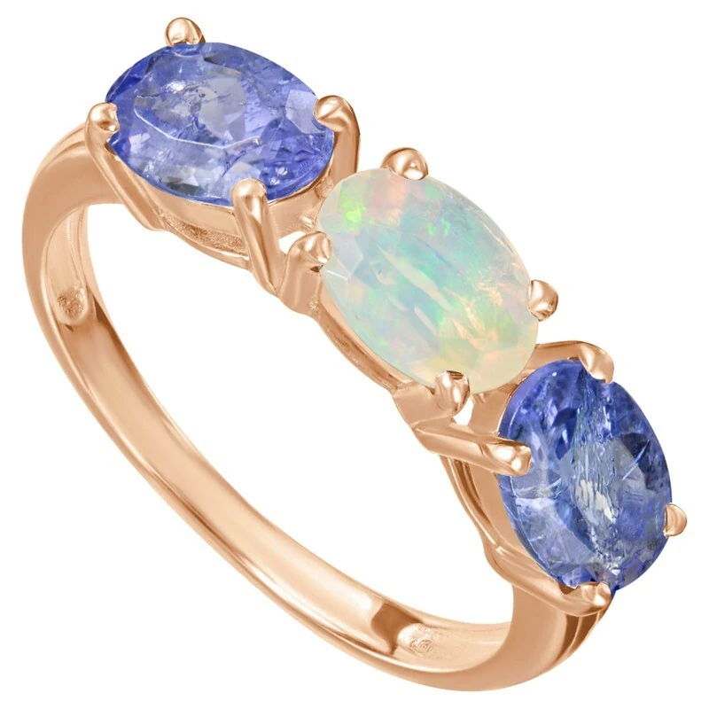 Серебряное кольцо с натуральными камнями танзанит и опал - коллекция Муза. Серебряное кольцо 925 пробы с покрытием красное золото. Цвет покрытия соответствует швейцарскому цветовому стандарту NIHS -5N и цвету красного золота 585 в России. На последней фотографии мы разместили сравнительную фотографию 3 цвета золотого покрытия. Помимо предания золотого цвета Вашему изделию, тонкий слой золота защищает от окисления. Для более стойкого эффекта золочения и долговечности покрытия мы дополнительно наносим подслой палладия (Pd). Средний вес изделия с камнями 2.79 гр. Месторождения: Танзанит (провинция Аруша, Танзания) и Опал (Эфиопия). Танзанит (Натуральный) овал 5*7 мм., средний вес: 0.89 карат. и Опал (Натуральный) овал 5*7 мм., средний вес: 0.46 карат. Все изделия собственного производства, гарантия 12 месяцев. Арт. 8091