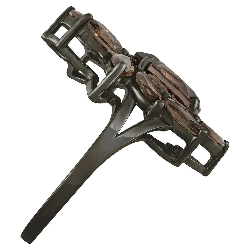 Серебряное кольцо "Элегия" с натуральным раухтопазом (дымчатый кварц) , покрытие Черный Родий. Средний вес украшения с камнями 3,43 гр. Месторождение(я) камней: Раухтопаз (Дымчатый кварц) (м-ние Додо ХМАО, Россия). Раухтопаз (Натуральный) груша: 7*10 мм., средний вес 1,85 карат. Раухтопаз (Натуральный) маркиз: 3*6 мм., средний вес 0,24 карат. Размер лицевой части: 15*23 мм. Все изделия собственного производства и имеют гарантию 12 месяцев. Арт. 6610BR. Раухтопаз – это разновидность кварца. Ранее он использовался в ювелирных украшениях, при вышивке картин, для магических ритуалов. Его влияние на владельца сразу становится заметно — человек успокаивается и становится рассудительным, легче выходит из депрессивных состояний. Часто использовался в приворотах, заговорах или для связи с миром духов.