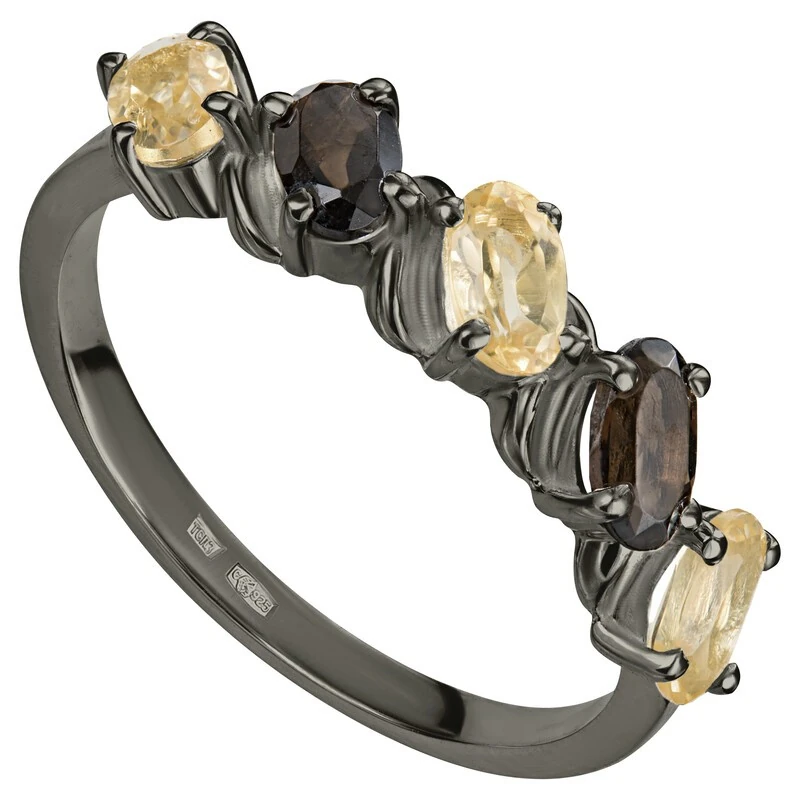 Серебряное кольцо с натуральными камнями цитрин и раухтопаз - коллекция Колосок, покрытие Черный Родий.