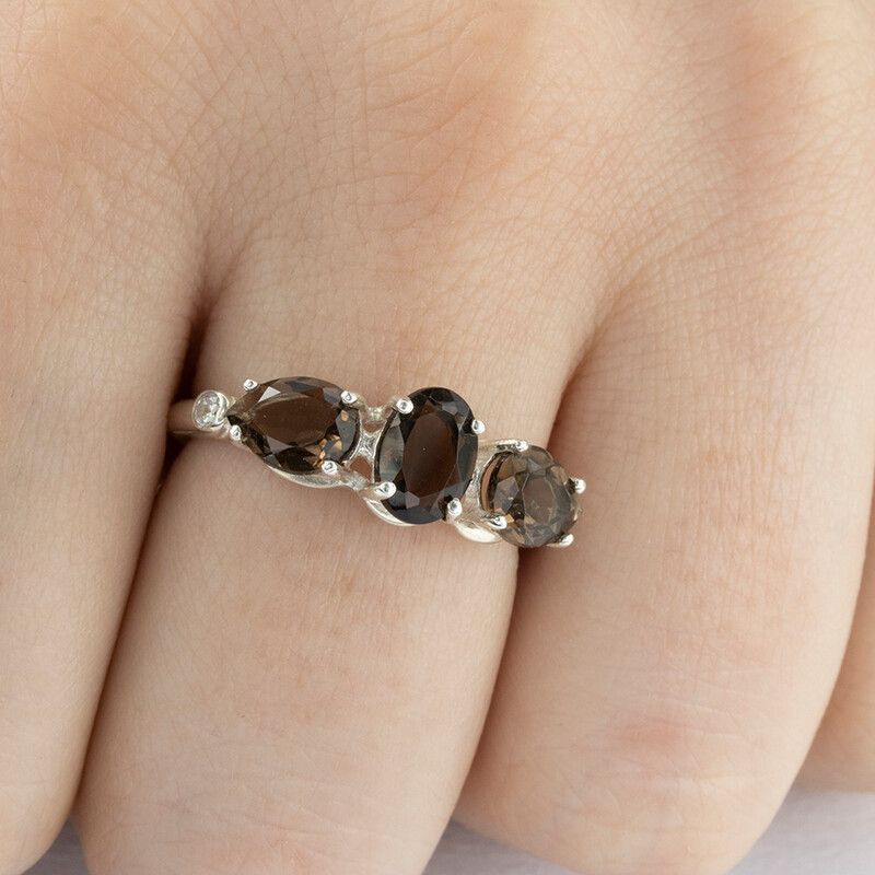 Серебряное кольцо с натуральным раухтопазом - коллекция Сансара / Без покрытия.Средний вес украшения с камнями 2.22 гр.Месторождение(я): Раухтопаз (Дымчатый кварц) (м-ие Додо ХМАО, Россия).Ювелирные вставки:Раухтопаз (Натуральный) овал 5*7 мм., средний вес: 0.75 карат.Раухтопаз (Натуральный) груша 5*7 мм., средний вес: 0.63 карат.Белый Нанокристалл круг 2 мм., средний вес: 0.06 карат.Все изделия собственного производства и имеют гарантию 12 месяцев. Арт. 8647NP. Раухтопаз – это разновидность кварца. Ранее он использовался в ювелирных украшениях, при вышивке картин, для магических ритуалов. Его влияние на владельца сразу становится заметно — человек успокаивается и становится рассудительным, легче выходит из депрессивных состояний. Часто использовался в приворотах, заговорах или для связи с миром духов.