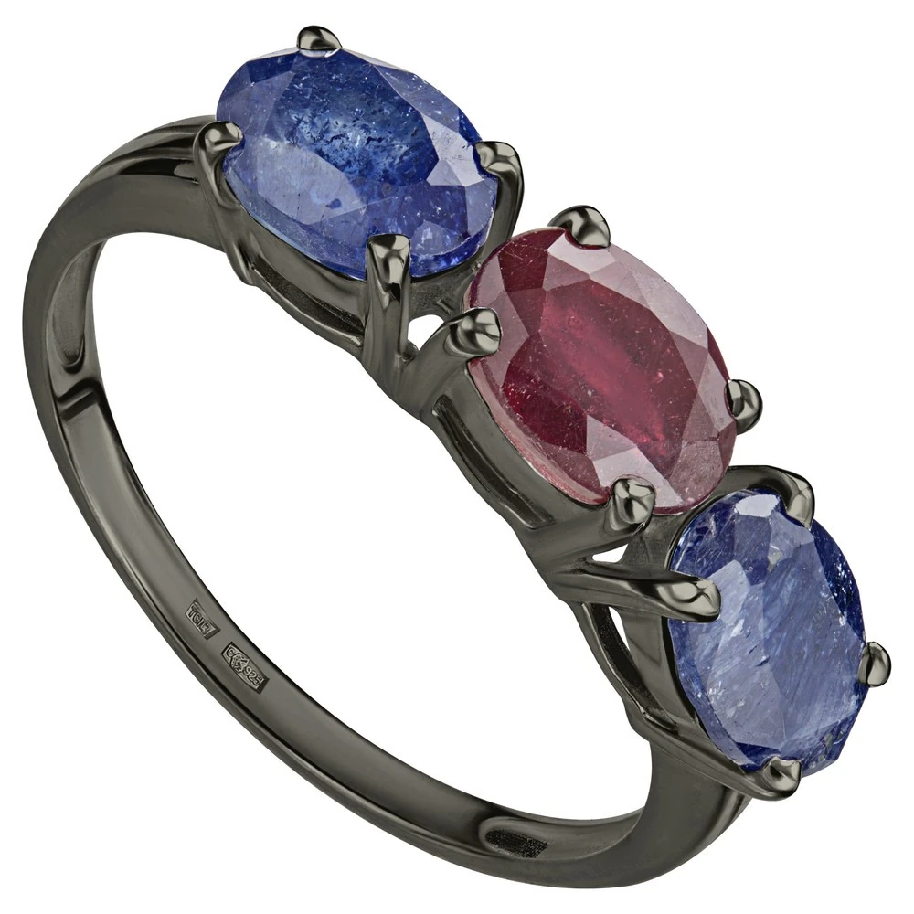 Серебряное кольцо с натуральными камнями сапфир и рубин - коллекция Муза, покрытие Черный Родий.
