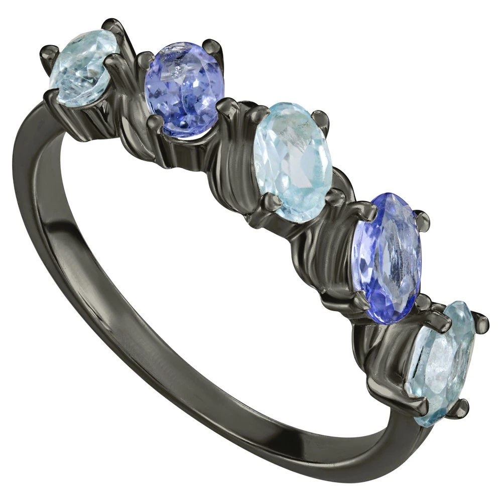 Серебряное кольцо с натуральными камнями топаз и танзанит - коллекция Колосок, покрытие Черный Родий.