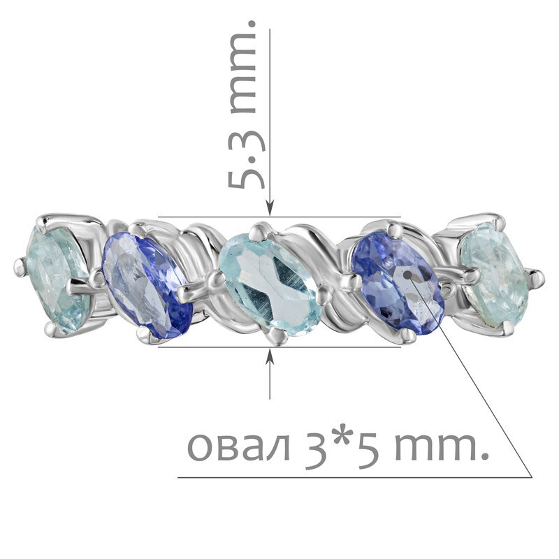 Серебряное кольцо с натуральными камнями топаз и танзанит - коллекция Колосок. Средний вес изделия с камнями 2.39 гр. Месторождения: Голубой топаз (Ильменские горы, Россия) и Танзанит (провинция Аруша, Танзания). Топаз (Натуральный) овал 3*5 мм., средний вес: 0.32 карат. и Танзанит (Натуральный) овал 3*5 мм., средний вес: 0.24 карат. Все изделия собственного производства, гарантия 12 месяцев. Арт. 8050