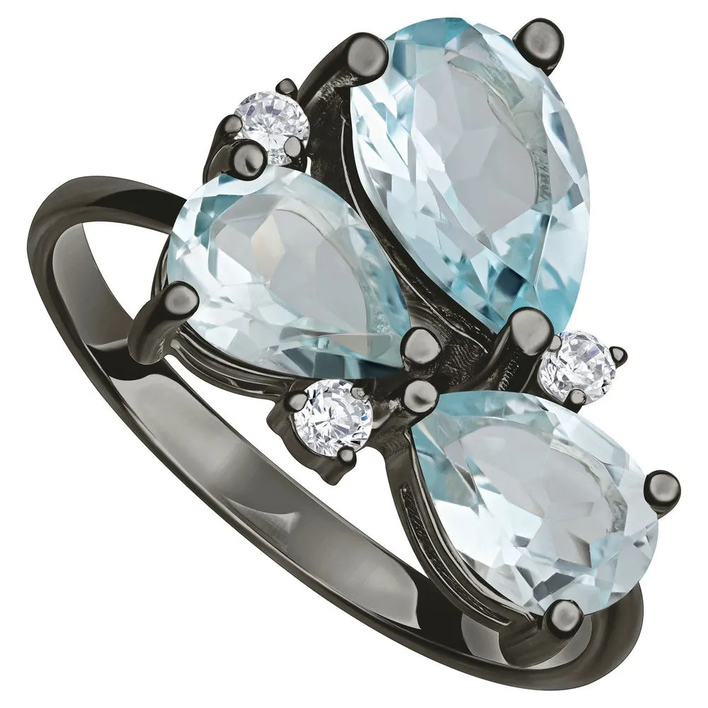 Серебряное кольцо "Капель" с натуральным голубым топазом, покрытие Черный Родий. Средний вес украшения с камнями 3,05 гр. Месторождение(я) камней: Топаз (Ильменские горы, Россия). Топаз (Натуральный) груша: 6*9 мм., средний вес 1,60 карат. Топаз (Натуральный) груша: 5*7 мм., средний вес 0,80 карат. Циркон белый (Натуральный) круг: 2 мм., средний вес 0,05 карат. Размер лицевой части: 13*15 мм. Все изделия собственного производства и имеют гарантию 12 месяцев. Арт. 6628BR. Топаз – камень, который отличаются особенным блеском и многообразной гаммой. Сверхтвёрдый и сверхпрочный, он наделен и лечебными, и магическими свойствами. Считалось, что амулет из топаза способен благоприятно повлиять на зачатие, потому часто дарился бездетным парам. Это камень дружбы и благоразумия, радости, оптимизма и надежды.
