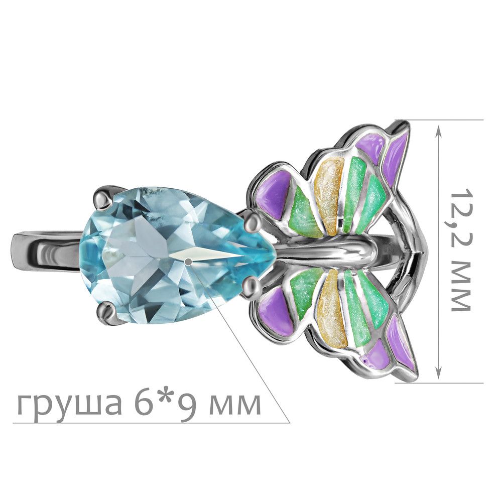 Серебряное кольцо с натуральным голубым топазом и эмалью - коллекция Бабочка, покрытие Палладий. Средний вес украшения с камнями 2.35 гр. Месторождение: Топаз (Ильменские горы, Россия). Топаз (Натуральный) груша 6*9 мм., средний вес: 1.59 карат. Все изделия собственного производства и имеют гарантию 12 месяцев, к каждому изделию прилагается паспорт. Арт. 8450PD. Топаз – камень, который отличаются особенным блеском и многообразной гаммой. Сверхтвёрдый и сверхпрочный, он наделен и лечебными, и магическими свойствами. Считалось, что амулет из топаза способен благоприятно повлиять на зачатие, потому часто дарился бездетным парам. Это камень дружбы и благоразумия, радости, оптимизма и надежды.