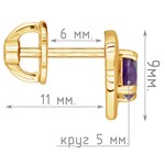 Серебряные серьги гвоздики (пусеты) с натуральным аметистом (темным) - Сердце / покрытие Желтое Золото.