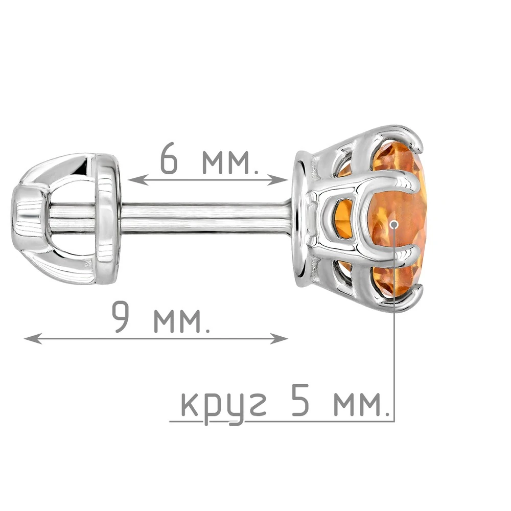 Серебряные серьги гвоздики (пусеты) с натуральным цитрином (мадейра) 5 мм. / Белый Родий.