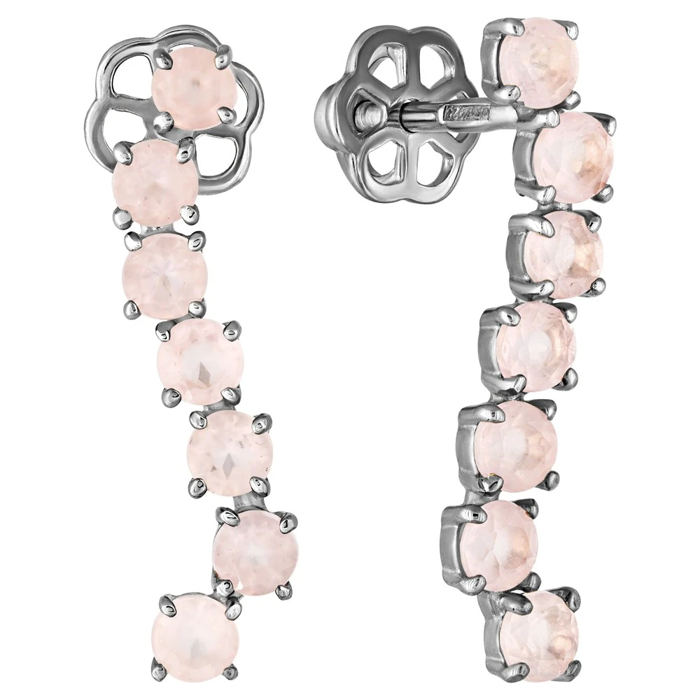Серебряные серьги с натуральным розовым кварцем - коллекция Волна / Палладий.