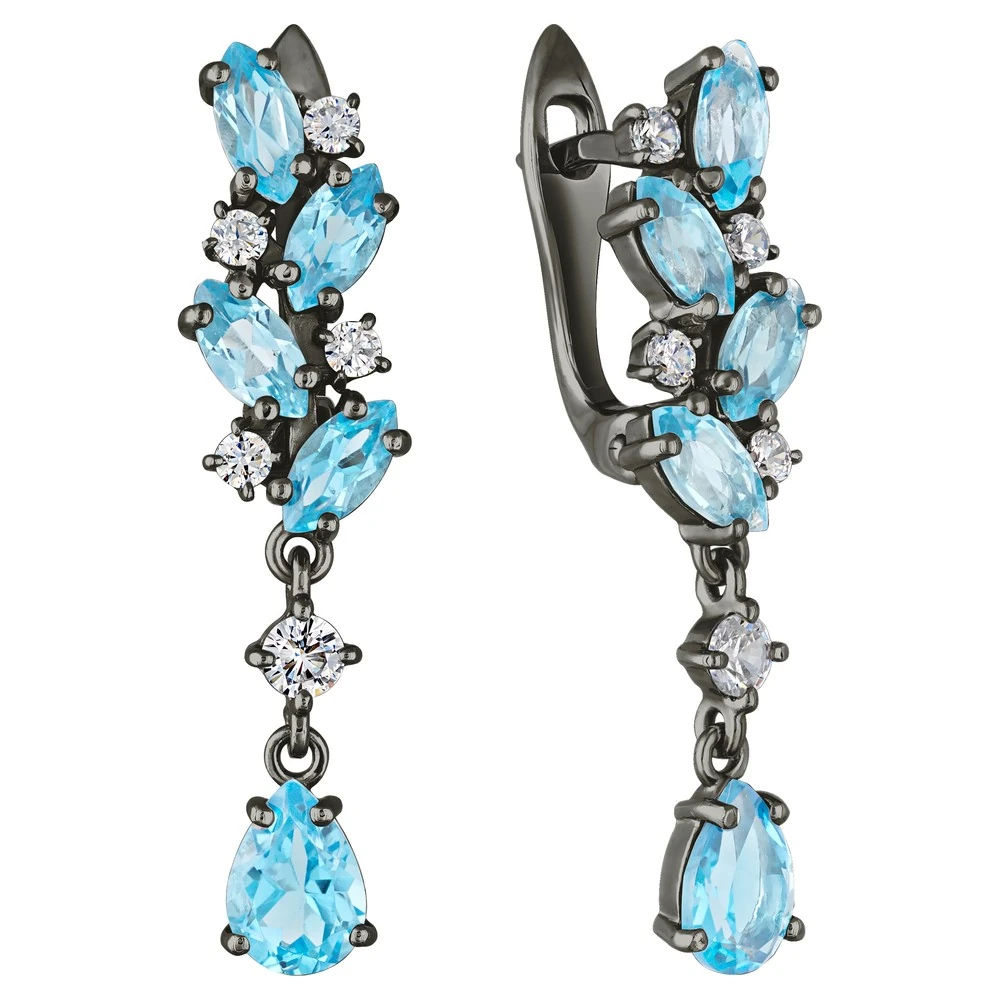 Серебряные серьги с натуральным голубым топазом (Swiss) - коллекция Росинка / Черный Родий.